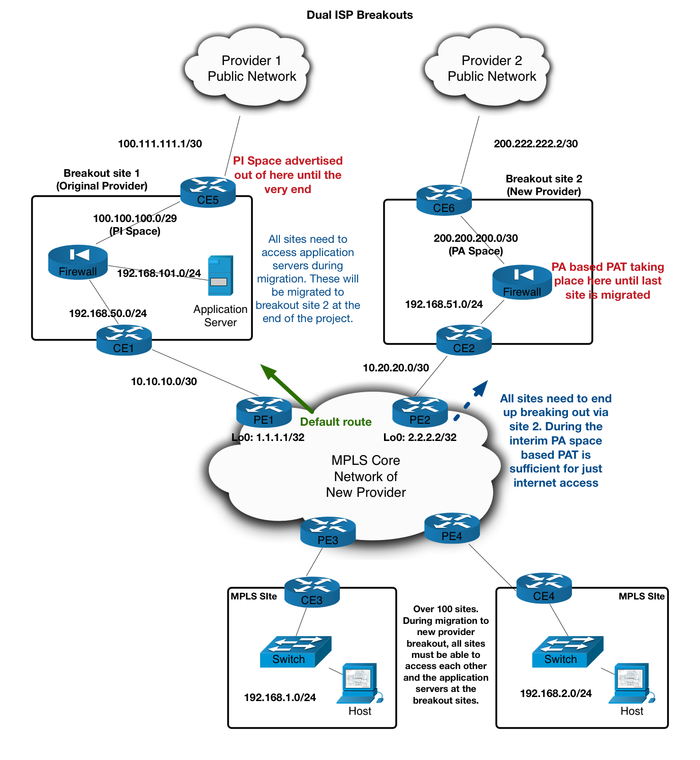 The customer had an L3VPN MPLS cloud with a new ISP, but still had their primary internet breakout with their old ISP.