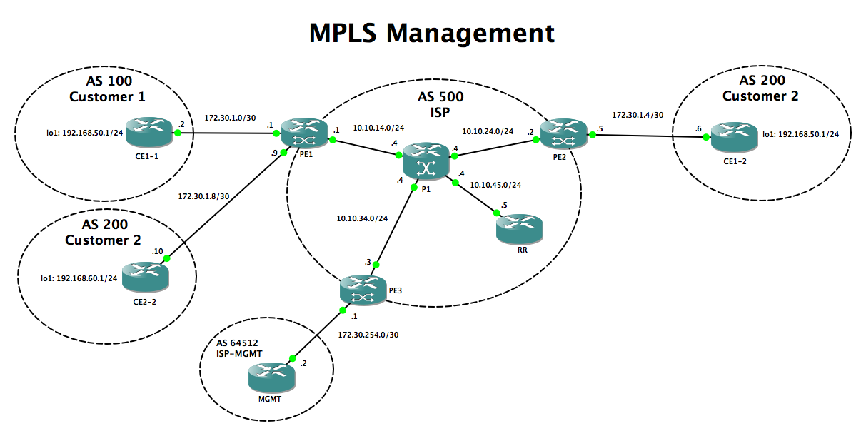 The ISPs ASN is 500. The two customer have ASNs 100 and 200 (depending on the setup these would typically be private ASNs, but they have been shown here as 100 and 200 for simplicity). A management router (MGMT) in ASN 64512 has access to the PE-CE WAN ranges for all of the customers, all of which come from the supernet 172.30.0.0/16. A special subnet within this range, 172.30.254.0/24, is reserved for the Management network itself. The MGMT router, or MPLS jump box as it may also be called, is connected to this range – as would any other devices requiring access to the MPLS customers devices (backup or monitoring systems for instance… not shown).