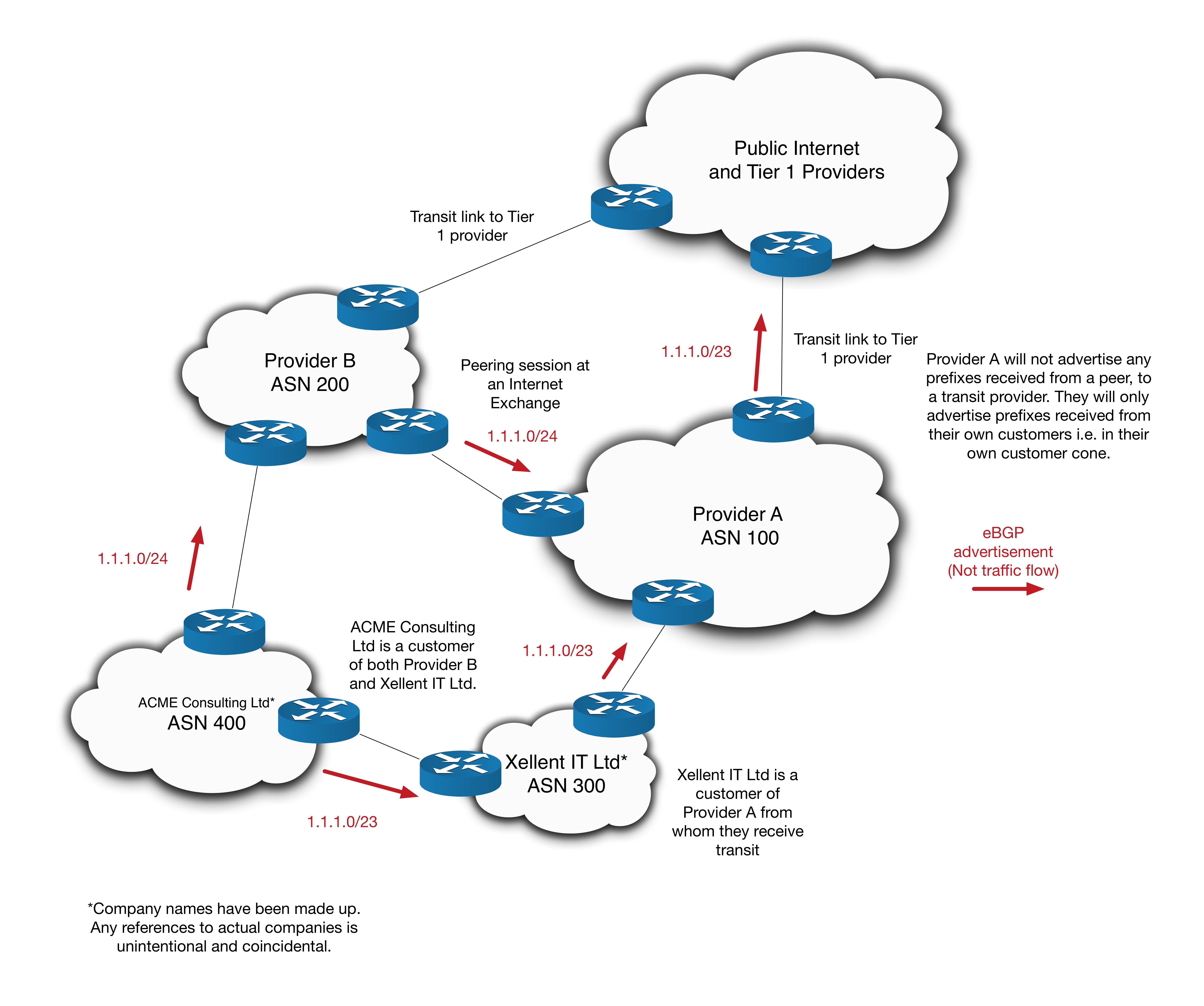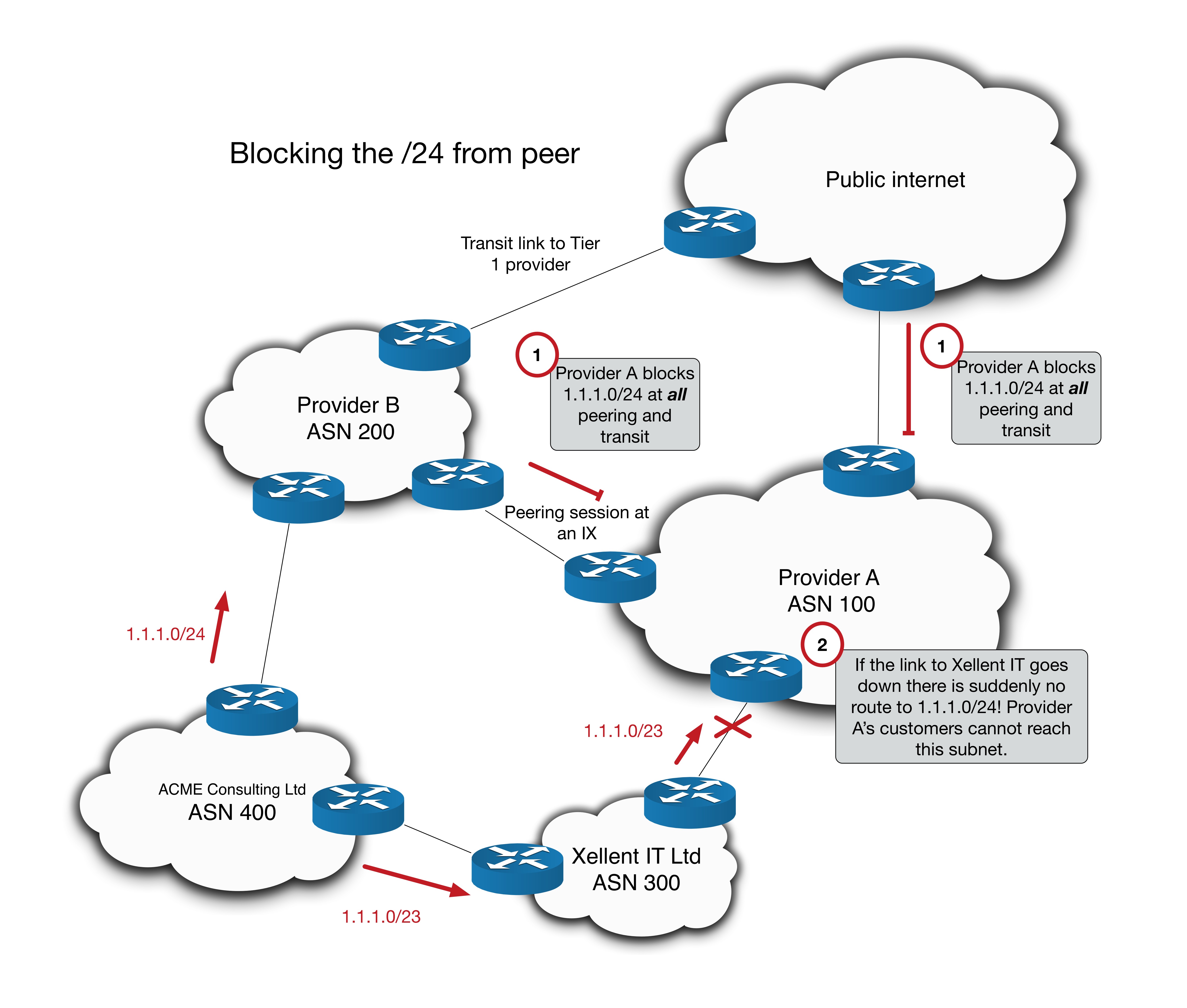 Let’s say Provider A applies an inbound route-map on its peering with Provider B (and all other peers and transits for that matter) to block any advertised prefixes that come from its own customer cone (basically, stopping its own prefixes being advertise towards itself from a non-customer). So Provider A would see Provider B advertising 1.1.1.0/24 and recognise that it as part of Xellent ITs supernet and block it.