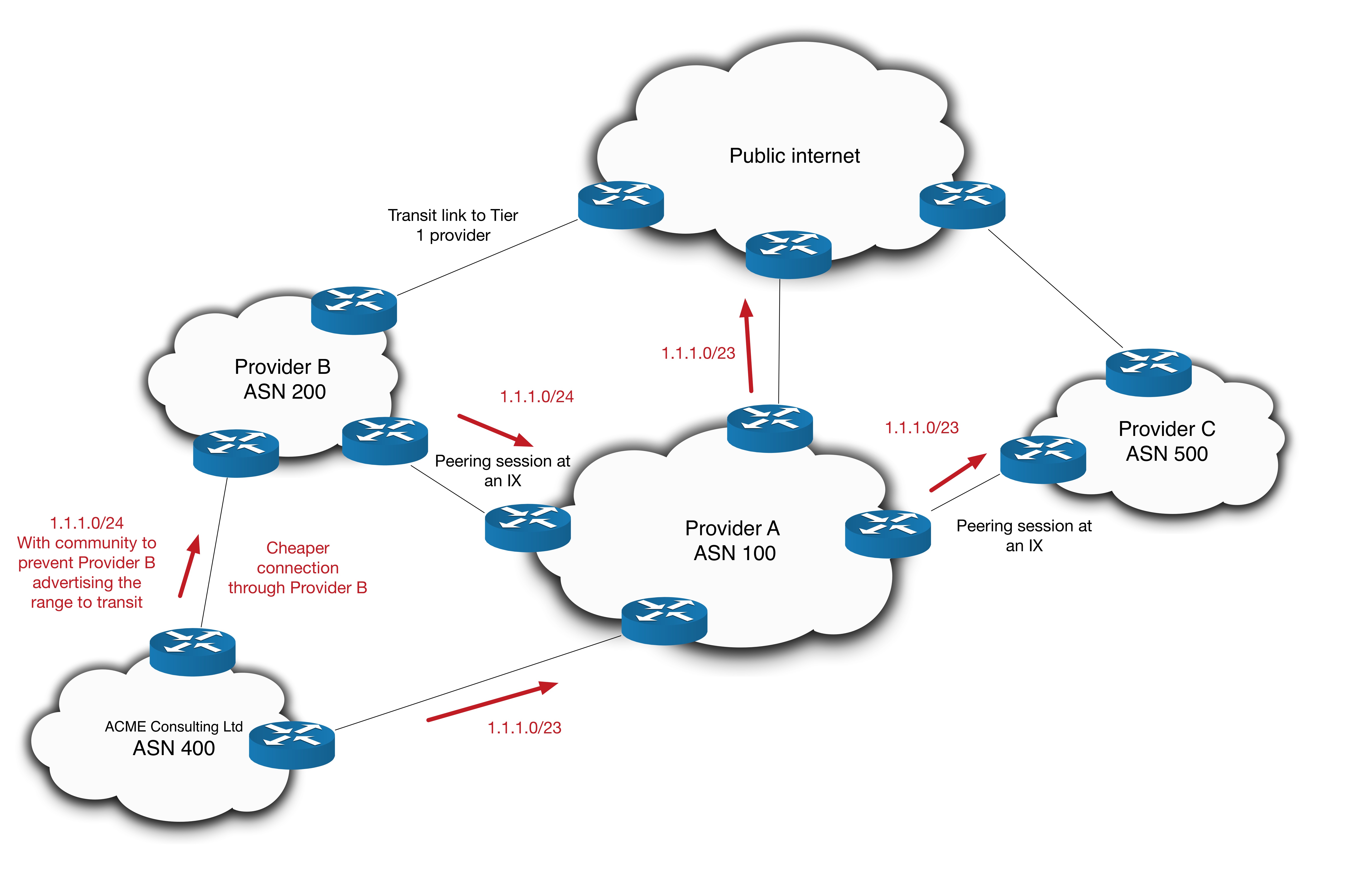 In this scenario, perhaps Provider B is offering such a service. ACME may have chosen to attach the ‘do not advertise this prefix to your transit provider x’ community to its BGP advertisement to Provider B. As a result, the /24 prefix doesn’t reach the router connecting to Provider A over its transit link, so it forwards according to the /23.