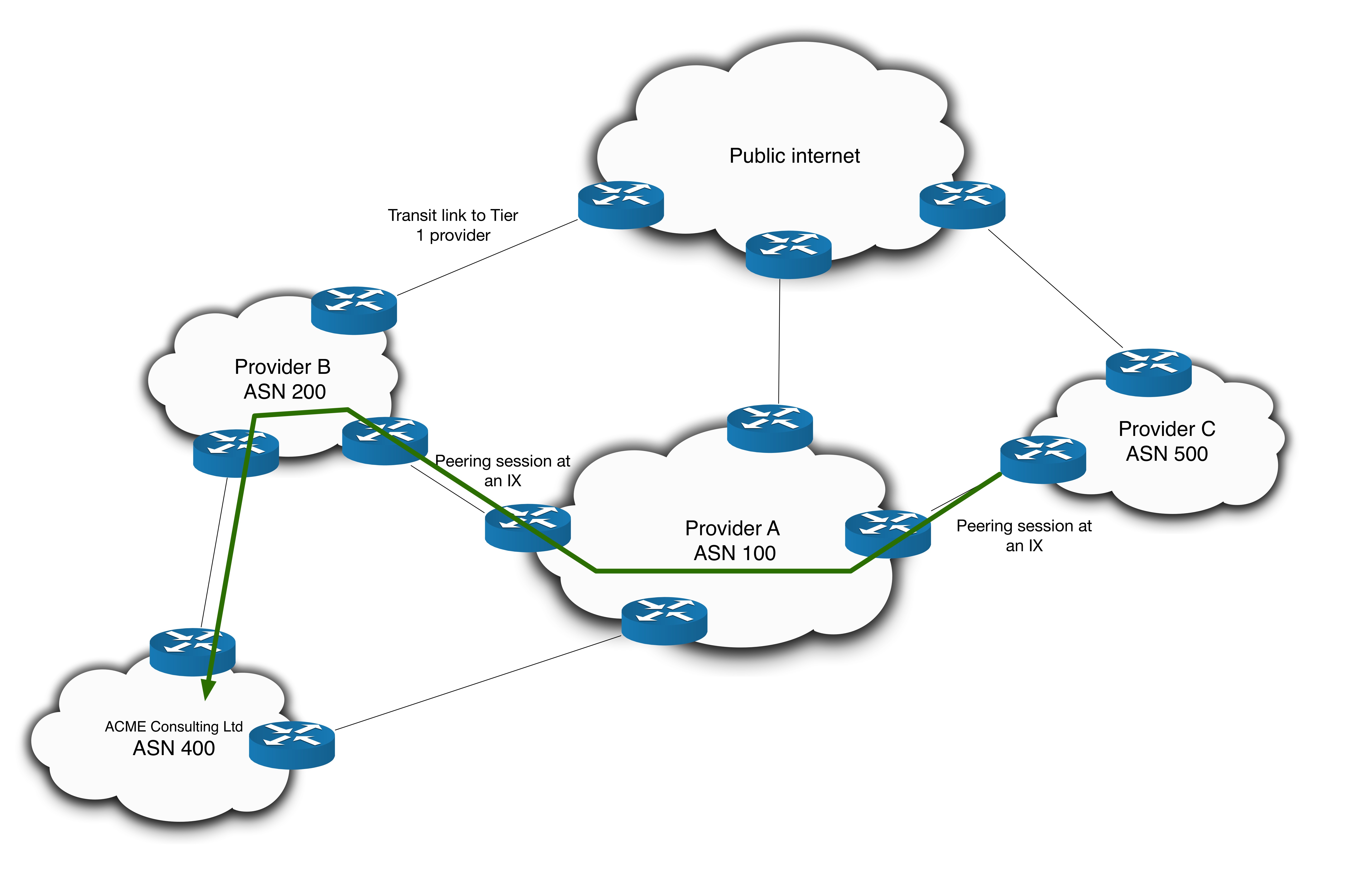 From here, ACME Consulting gets complaints from its customers that they can’t access their webserver. ACME contacts its transit providers and before you know it, an engineer at Provider B has done a traceroute and calls Provider A to ask why the final hop in the failed trace ends in Provider As network.