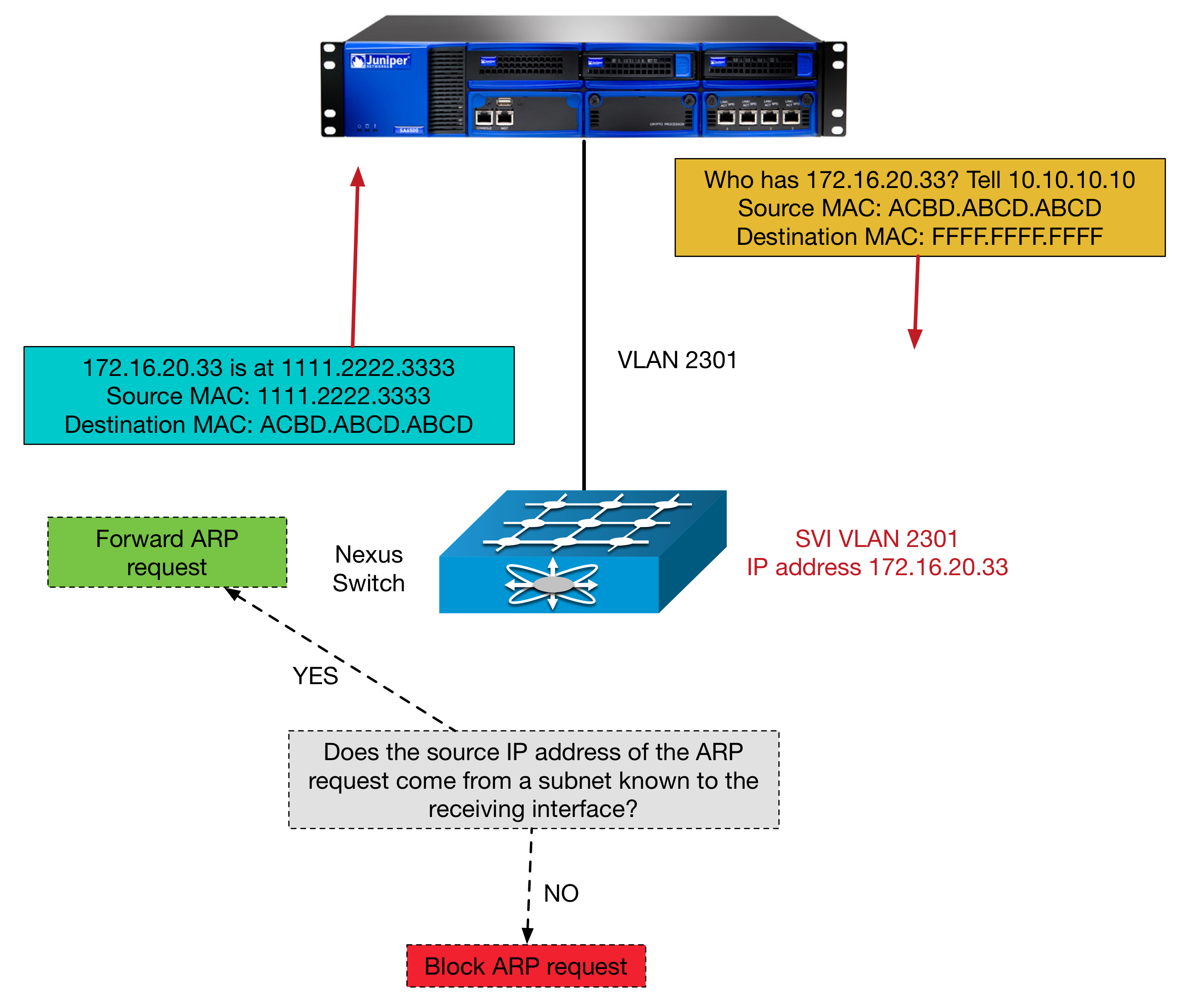 In our example case, the Nexus switch does not recognise 10.10.10.10 as a valid source IP for the receiving interfaces (which has IP 172.16.20.33). It sees it as off-net. We could also see the ARP check failing by using debug ip arp packet on the switch.