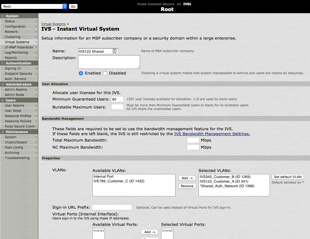 Customers can have either a Shared or Dedicated VPN solution. These solutions are called IVS’s (or Instant Virtual Systems). You can have multiple IVS’s on a single IVE appliance.