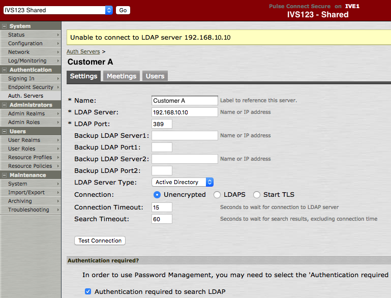 Whatever the reason for this behaviour, the result is that packets sourced from a Shared IVS Platform communicating to one of its customer’s Dedicated authentication servers, will be sending packets with a source IP of the Shared Auth VLAN. But such a customer isn’t using Shared Auth. Their network doesn’t know or care about the Shared Auth environment. So when their Dedicated LDAP server receives an authentication request from the IVE, it sees the source IP address as being from this Shared Auth VLAN.