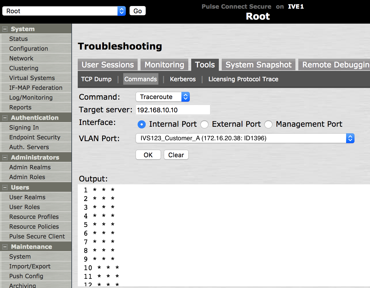 Once the move was completed and the IVE was connected to the Nexus switches everything seemed fine at first glance. Users with Dedicated IVS’s worked. Users on Shared IVS’s who utilised the Shared Auth server could also login and authenticate correctly. However a problem was found when checking any customer who had a VPN solution configured on a Shared IVS platform with Dedicated Authentication. Despite the customer login page showing up (implying that the public facing external side was working), authentication requests to their Dedicated Auth Servers were failing.