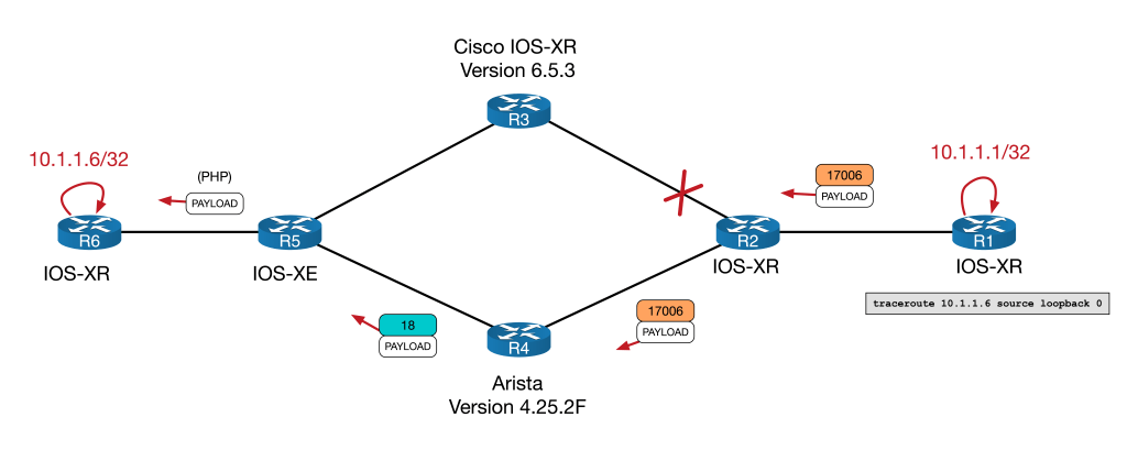 With the increased introduction of Segment Routing as the label distribution method used by Service Providers, there will inevitably be clashes with the tried and true LDP protocol. Indeed, interoperation between SR and LDP is one of the most important features to consider when introducing SR into a network. But what happen if there is no SR-LDP interoperation to be had? This is definitely the case for IPv6, since LDP for IPv6 is, more often than not, non-existent. This is exactly what this quirk will explore. More specifically, it explores how two different vendors, namely Cisco and Arista, tackle an LSP problem involving native IPv6 MPLS2IP forwarding.