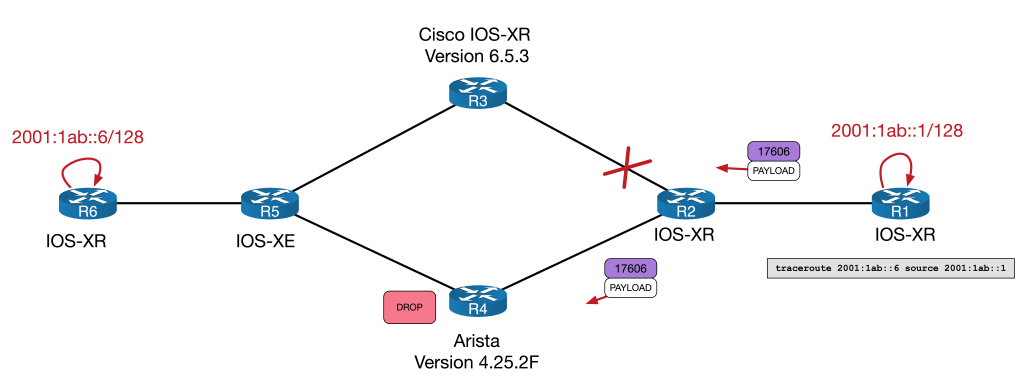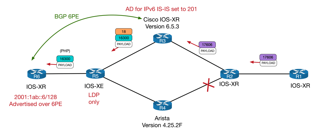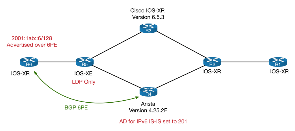 To explore the quirk, we will look at forwarding from R1 to R6, loopback-to-loopback. Notice that R3 (a Cisco) and R4 (an Arista) sit on the SR/LDP boundary. IPv4 will be looked at first, to help explain the interoperation between SR and LDP. Once that is done, I’ll demonstrate how each vendor handles IPv6 forwarding differently, which results in forwarding problems.