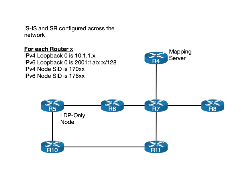 All devices in this topology are configured to run SR with no LDP, with the exception of R5, which is LDP-only. This comparison looks at R4, which is configured to run SR and act as a mapping server so that those nodes that do not run LDP know what LFIB entry to install when forwarding traffic to R5’s loopback. This also highlights a key different between IOS-XE and IOS-XR Segment Routing capabilities in that IOS-XE does not support the configuration or forwarding of IPv6 Node-SIDs.