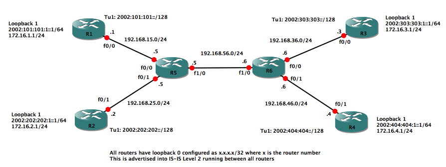 Preconfigured lab with dynamic IPv6 6to4 tunnelling implemented. A cheat sheet for 6to4 tunnelling can be found here.