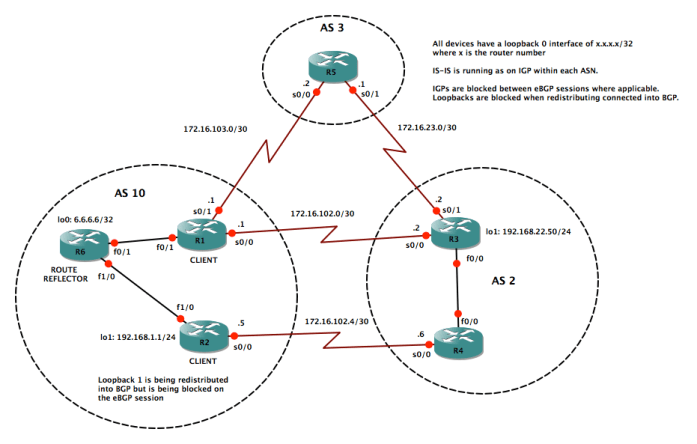 A very basic lab showing BGP setup between 3 ASNs. Route-maps, prefix-lists, Router Reflection and redistribution are all used.