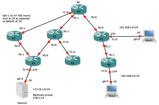 Very basic PIM-BiDir lab. R4 is an RP placed at the top of the topology. There is one source and two hosts. Both hosts have joined the multicast group 228.1.1.9 using the ip igmp join-group 228.1.1.9 sub-interface command. Start multicast traffic by implementing a constant ping from the source device to 228.1.1.9.