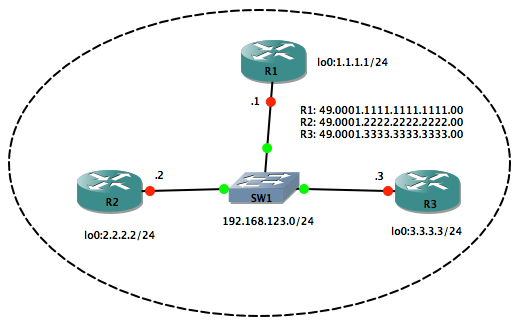 This is a very basic lab that currently runs IS-IS Level 1 in a single area. An interest quirk to note is that R1 has had ip router isis configured under its loopback, whereas R2 and R3 have had passive-interface loopback0 configured under the IS-IS process. The effect of this is that the metric to reach loopback0 on R1 will be higher as reaching the loopback is considered an extra ‘hop’ or link. Also, level-2 has not been explicitly disabled under the IS-IS processes anywhere in this lab, so default leaking of IP entries (but not IS entries) in the LSPs from L1 to L2 is taking place.