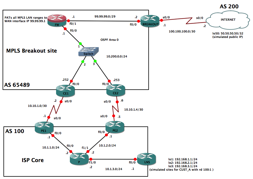 This lab provides an MPLS core network with a dual homed breakout site consisting of two MPLS facing CEs, a breakout firewall and an internet facing CE. A default route is advertised from the internet, redistributed into OSPF and the redistributed again into MPLS. Remote MPLS site are represented by loopbacks on the LNS router (representing an L2TP Network Server, though it is really just running basic BGP and MPLS). Tagging and route-maps are used on CE1 and CE2 to prevent redistribution back into MPLS and asymmetric routing. The routers named FW and INTERNET have had their symbols changed but they are Cisco routers.