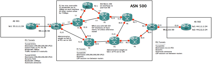 At number of points (as indicated on the topology) the TE Administrative Weight of several interfaces has been adjusted to manipulate the tunnel paths.