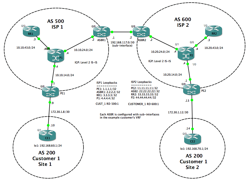 This lab has two different ISP ASNs connecting to each other over a sub-interfaced link. This link has been placed into the customers VRF, which has been configured on both ASBRs. A standard IPv4 eBGP session has been created across the link to exchange routes. This method is commonly referred to as Option A.