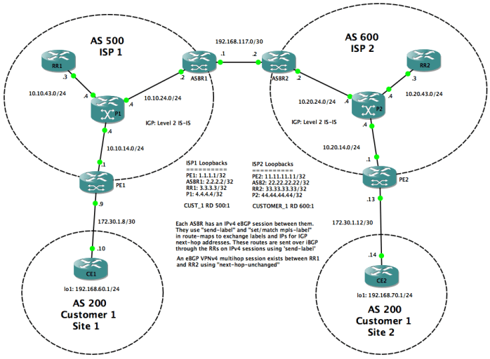 This lab shows two ISPs exchanging VPN labels over a multi-hop eBGP session between their route reflectors – in other words, Inter-AS Option C.